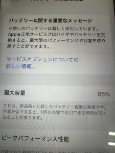 バッテリーの状態を確認すると、最大容量が85%になっていました。