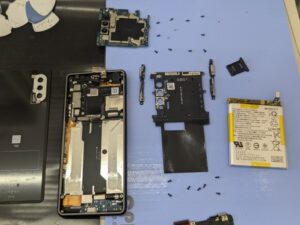 この機種はバックパネルから外していくタイプです。まずはバックパネル、次にミドルフレーム、さらにバッテリーと外してようやくサイドボタンがあらわになります。