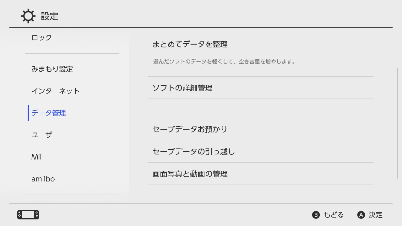 開くと設定一覧が表示されますので、「データ管理」を選びます。