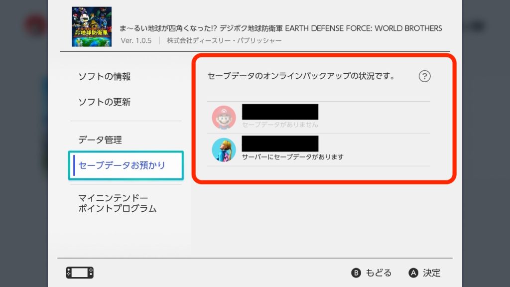 バックアップしたいアカウントを選択するとセーブデータのバックアップ状況が確認できます。