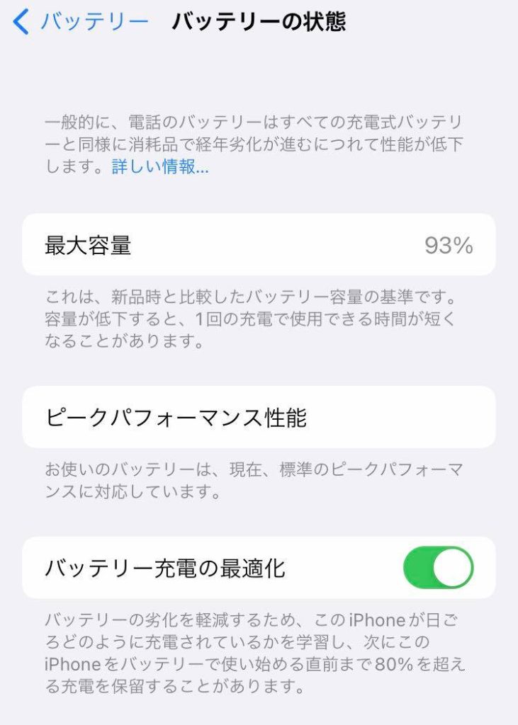 フル充電しても93%までしか充電ができない状態であることを示しています。
