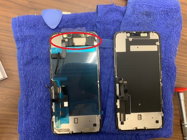 取り外した後は、ホームボタンはございませんが、イヤースピーカーとセンサーケーブルのセットを新しい部品側へ移植する必要があります。