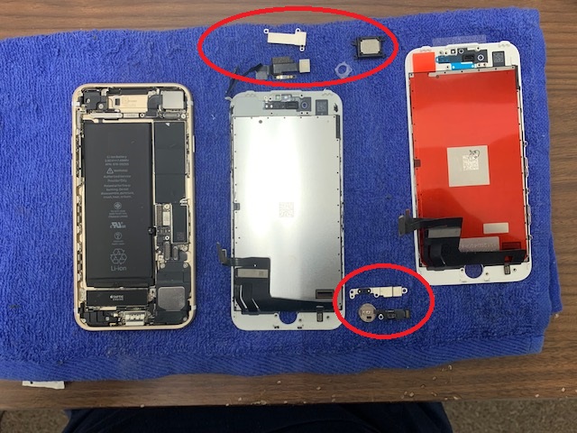 画面が外れたら、割れ画面からイヤースピーカー、センサーケーブル、ホームボタンを移植します。