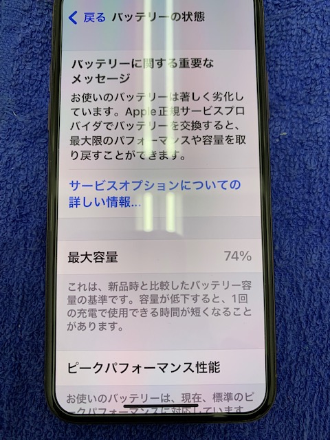 交換前に店頭でバッテリーの最大容量を確認してみると既に74%にまで低下しておりました。