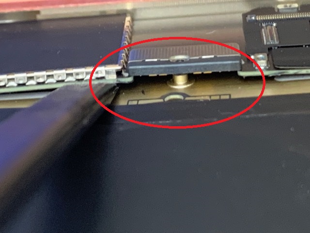 基板を少し浮かせるようにして、基盤とバッテリーの端子との間に非伝導体を挟み込むようにして、バッテリーの接続を解除しましょう。