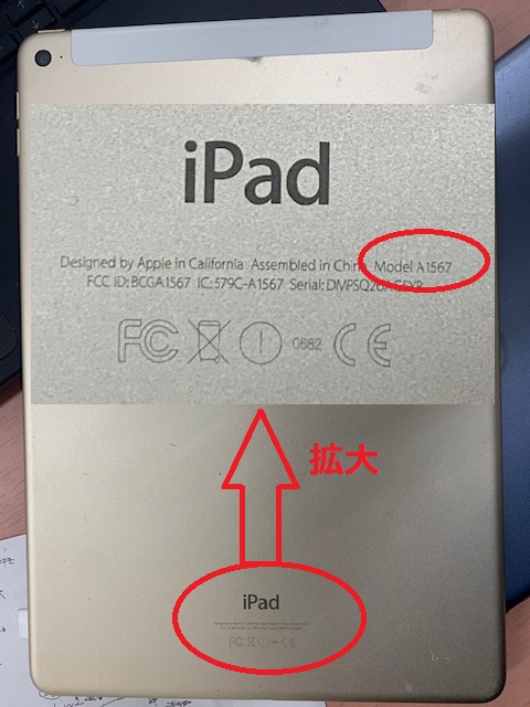 iPadの修理費用のお見積りをご検討されている方は、【設定】–【一般】–【情報】のところから機種名をご確認頂くか裏面のA1567などのモベル番号をお調べのうえでお問い合わせ頂ければと思います。