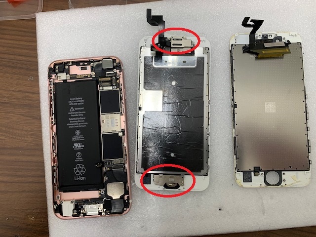 後は割れた画面部品に固定されているイヤースピーカーケーブルやホームボタンなどを新しい画面部品へと移植して、仮組み状態で動作確認。