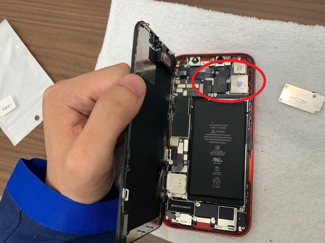 バッテリー交換やドックコネクター(充電口)部品の交換の場合は、作業のしやすさの確保の問題から画面部品を一度取り外してから作業しますが、バックカメラは取り外しがかなり簡易なので、そのまま作業してしまいます。
