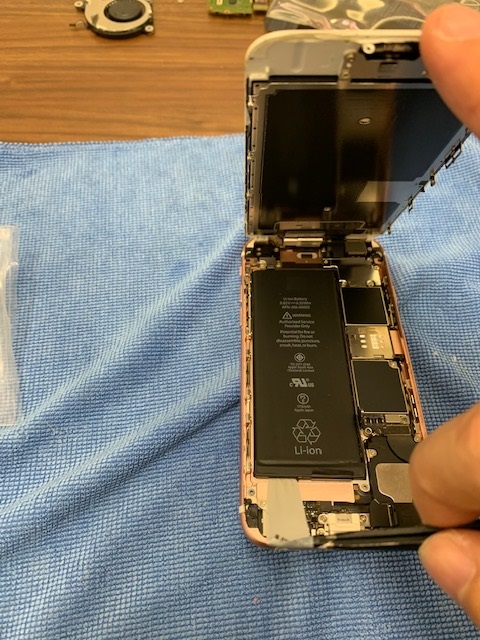 iPhone6sは、7以降のシリーズとは異なり、液晶画面などのケーブルが上の方に繋がっておりますので、縦に開いていきます。