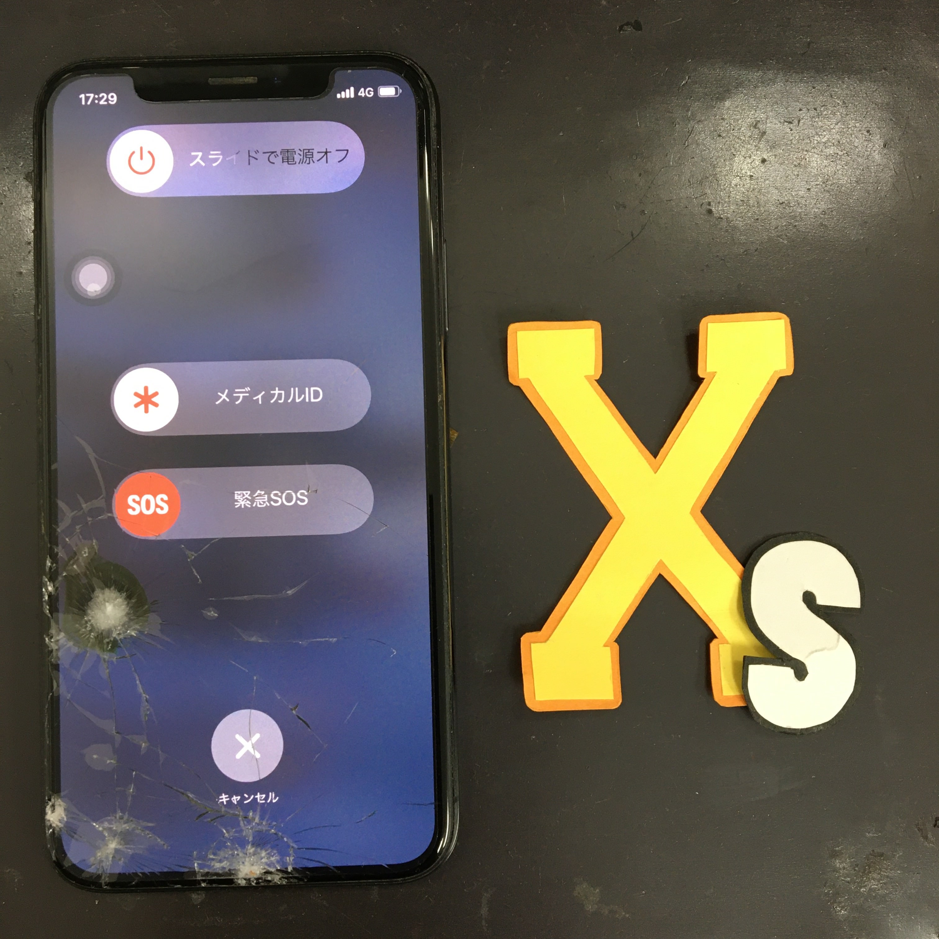 修理するiPhoen XSは写真からみてわかるほど一部ボコッとへこみがあるくらい割れていました。