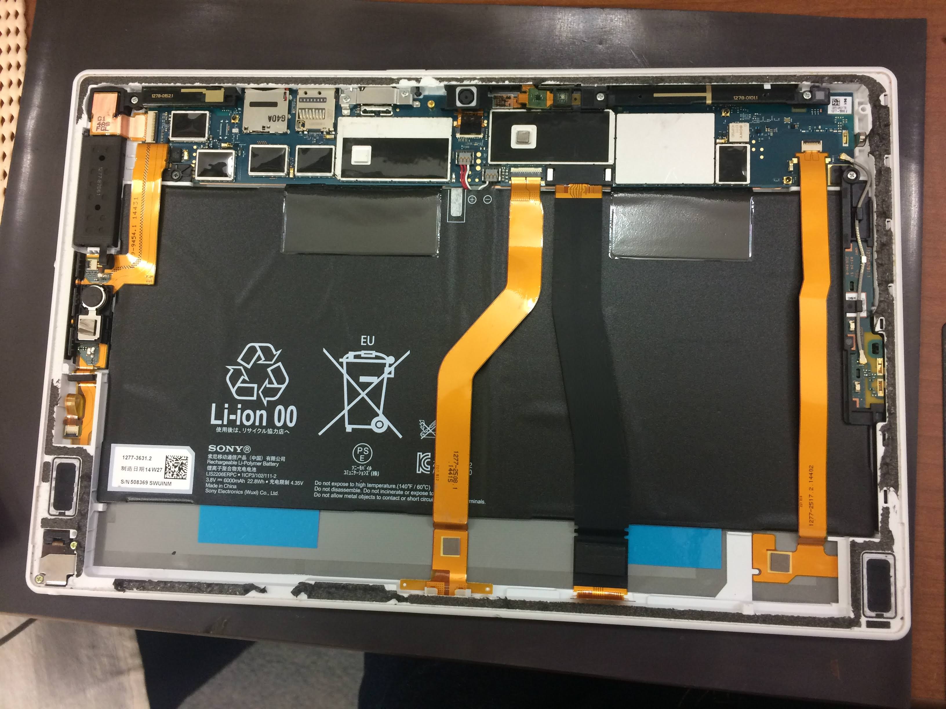 Xperia Z2 Tablet(SO-05F)の中身はこんな風になっております。ほとんどの面積を大きなバッテリーで覆っていますね。