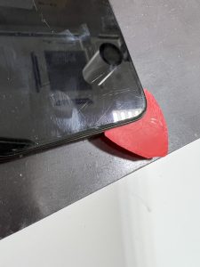 星ネジを外したら、次は画面とフレームの間にピックを差し込み画面を持ち上げていきます。