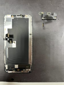 次に、新しい画面に先ほどのイヤースピーカーと近接センサーを移植します。ネジは場所によって長さや種類が異なるので、はめる場所を間違えないように正確に組み上げていきましょう!