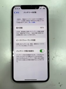 バッテリーの最大容量を見てみると、90%と表示されていました。