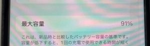 ②バッテリーの順でタップ。今回のお客様の端末の最大容量は91%と表示されていました。
