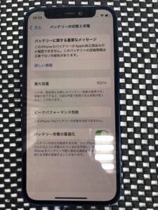 非正規店ではApple純正のパーツを取り扱っていないため、画面上のようなメッセージが表示され、最大容量は見れなくなります。