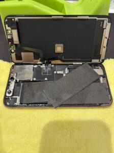 iPhone11Proの内部を見てみると水分がかなり画面の裏側や基板付近に付着しておりました