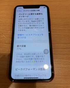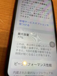ちなみに受付時に設定からバッテリー最大容量を拝見しますと77%と