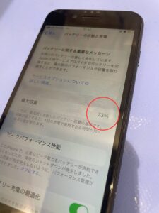 ちなみに設定からバッテリー最大容量を拝見させていただきますと73%とかなり劣化していました。