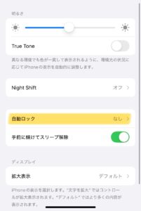 設定→画面表示と明るさ→自動ロック→「1分~5分」または、「なし」を選べます