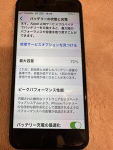 今回、お持ち込みいただいたiPhoneSE2のバッテリー最大容量は72%でした。