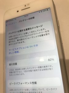 すると、82%でAppleからバッテリーが著しく劣化しているとメッセージが表示されていました。