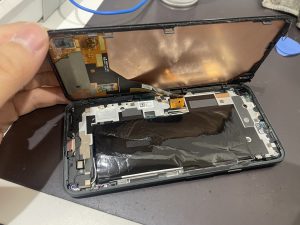 今回ご依頼いただきましたGooglepixel5aは表のフロントパネル画面側から開ける修理となります。