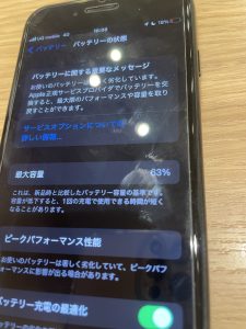 iPhone7のバッテリーの最大容量が63%まで落ちてしまっています。