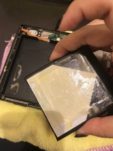 そして新しい粘着のテープを貼り、新しいバッテリーを付けていきます。