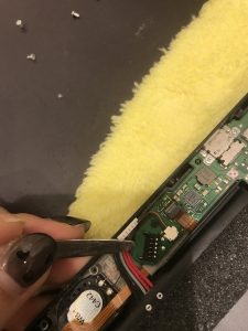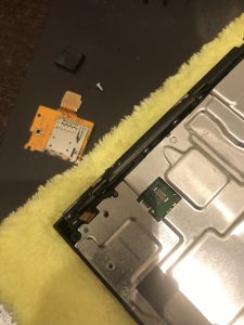 左端にあるのでまずはネジを1つ外してからSDカードトレーのコネクタをヘラで外し