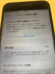 写真のようにバッテリーの最大容量が74%とかなり劣化している状態でした。