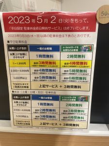 土日祝日は2000円から2時間無料、5000円以上のお買い上げで3時間無料となっています。