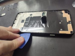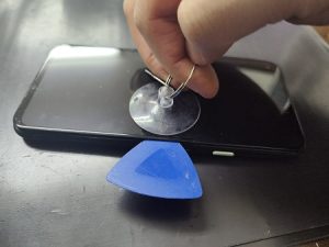 吸盤で画面を持ち上げ、隙間ができたらピックを差し込みます。