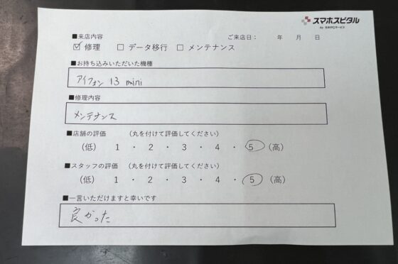【お客様の声】iPhone 13miniのメンテナンスのお客様にお声をいただきました。