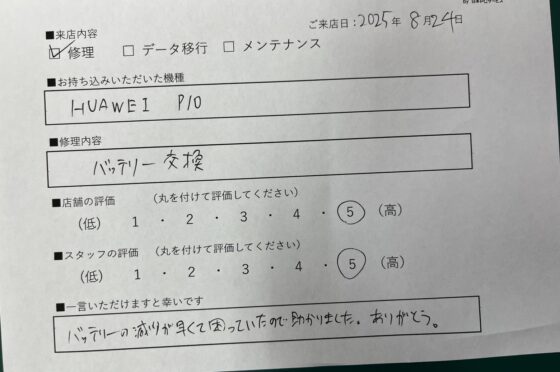 【お客様の声】HUAWEI P10のバッテリー交換のお客様にお声をいただきました。