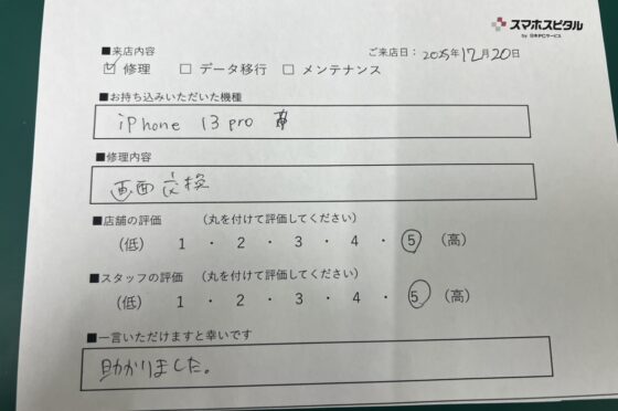 【お客様の声】iPhone 13Proの画面交換のお客様にお声をいただきました。