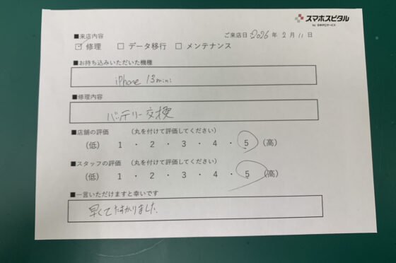 【お客様の声】iPhone 13miniのバッテリー交換のお客様にお声をいただきました。