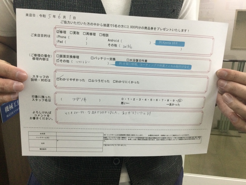 スマホスピタル京橋 【お客様の声】任天堂Switchのソフトトレーを交換してもらいました