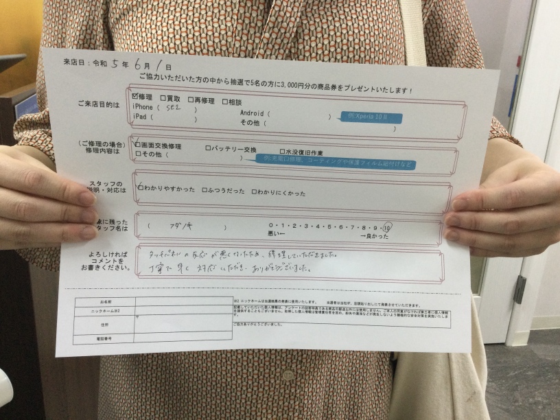 スマホスピタル京橋 【お客様の声】iPhoneSE2世代画面修理してもらいました