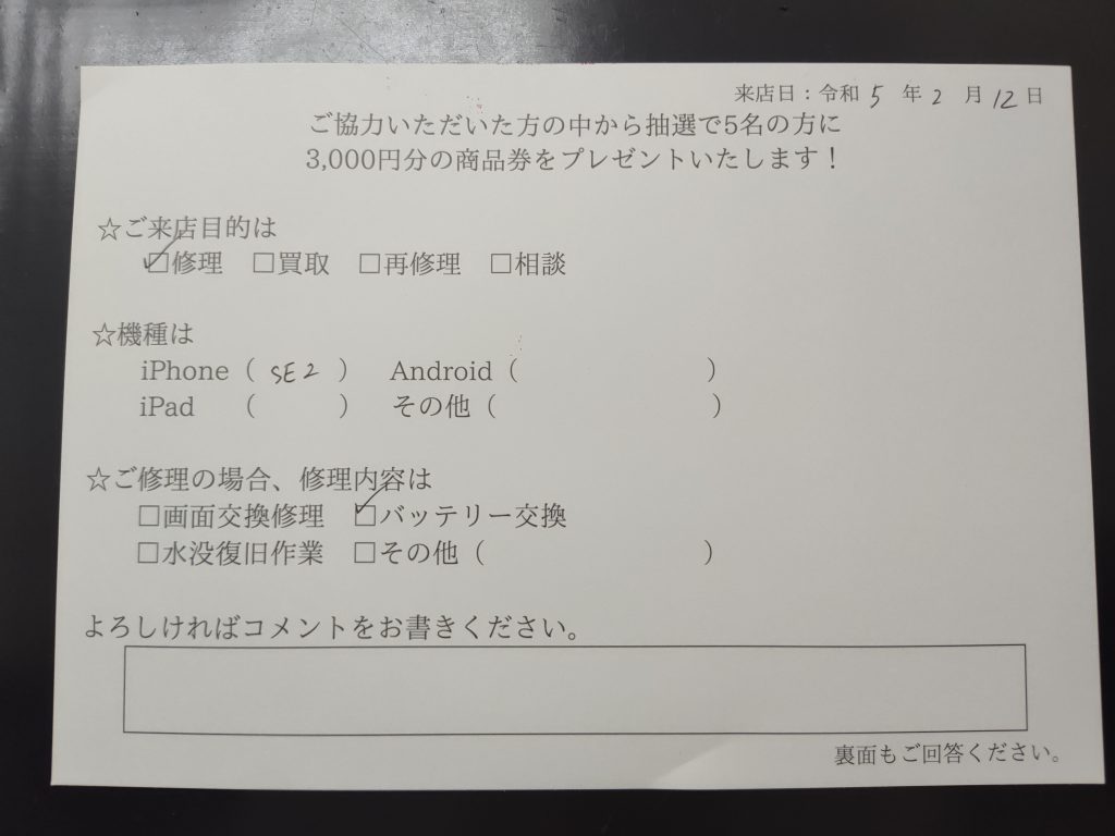スマホスピタル京橋 iPhone SE2のバッテリー交換を行いました