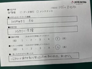 スマホスピタル京橋 【お客様の声】HUAWEI P10のバッテリー交換のお客様にお声をいただきました。