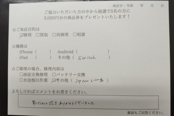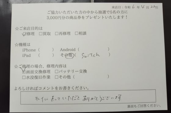 Nintendo Switchの液晶の交換を行いました