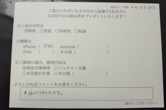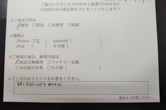【お客様の声】iPhoneSE(第2世代)の画面交換を行いました!