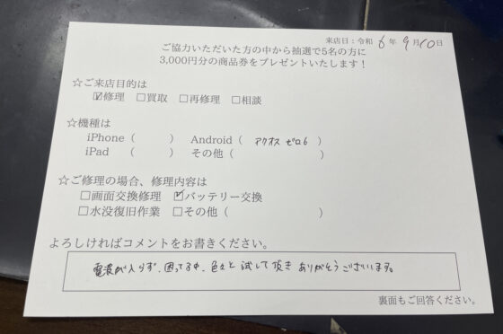 【お客様の声】AQUOS zero6 バッテリー交換をしました