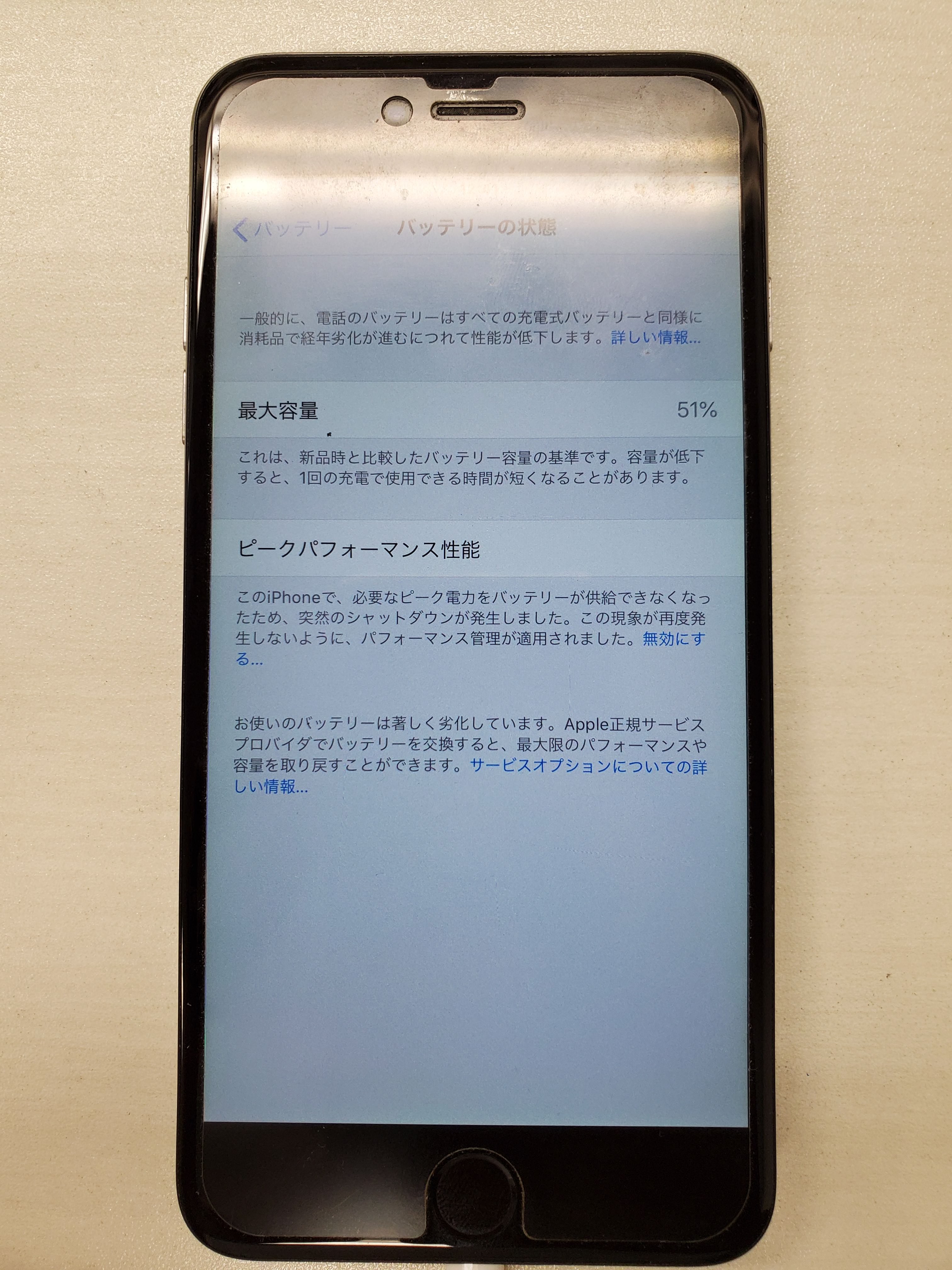 バッテリーが半日も持たないというのはあまり無い症状にはなるので、もしかしたら基盤の不具合かもと思ったのですが、バッテリーの最大容量を確認してみると、51%でした。ここまで劣化してしまうと半日持たないでしょう。