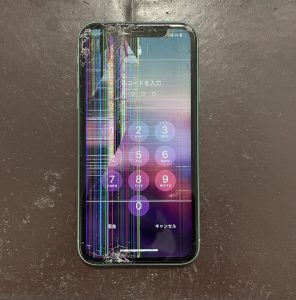 ご依頼いただきましたiPhone11は地面に落としてしまって画面が割れてしまったものになります。