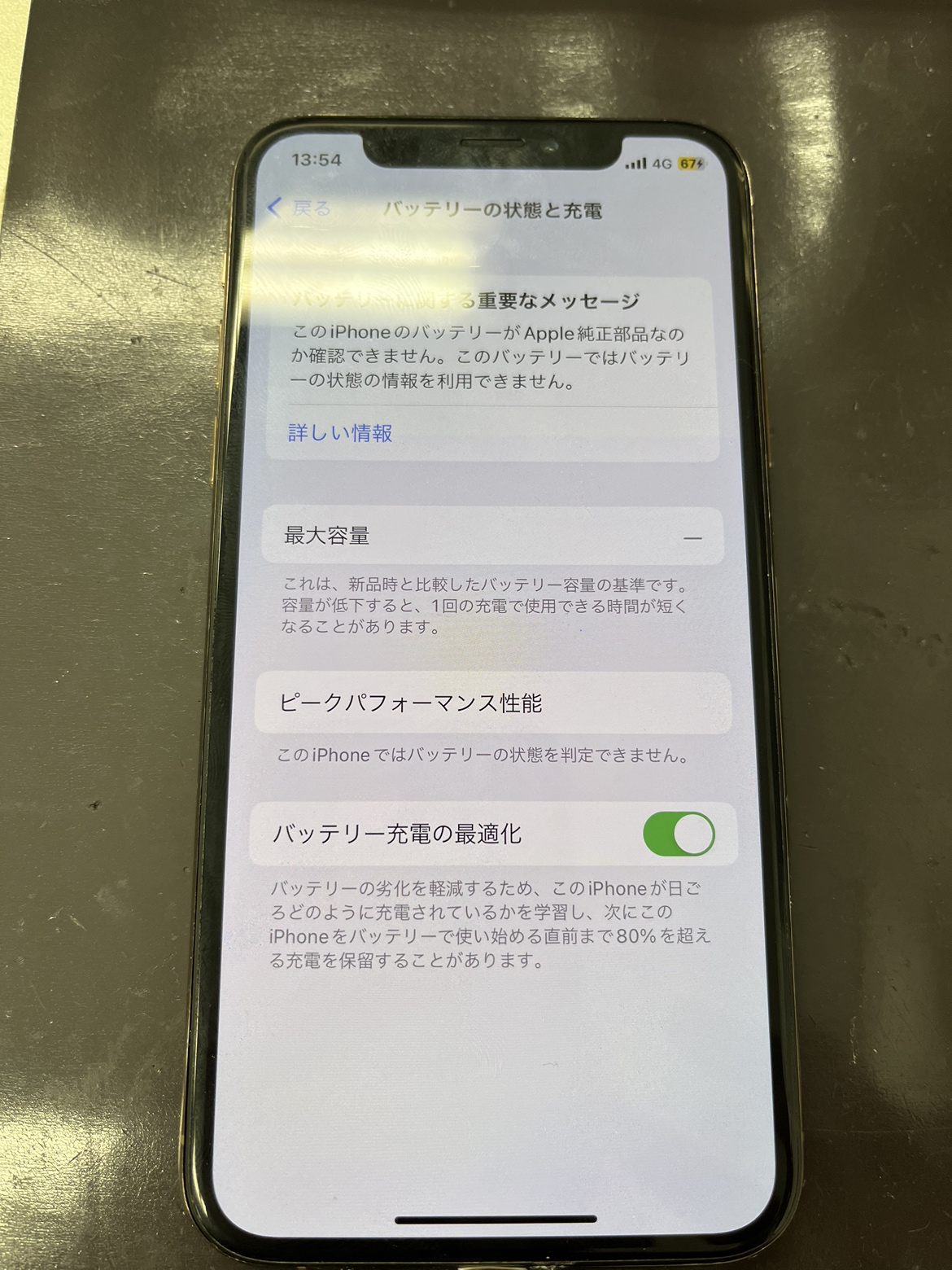 このように、修理後は最大容量が「ー」の表記に変わります。