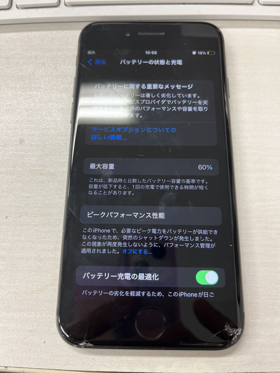 今回紹介する修理内容は、バッテリーの最大容量が60%で