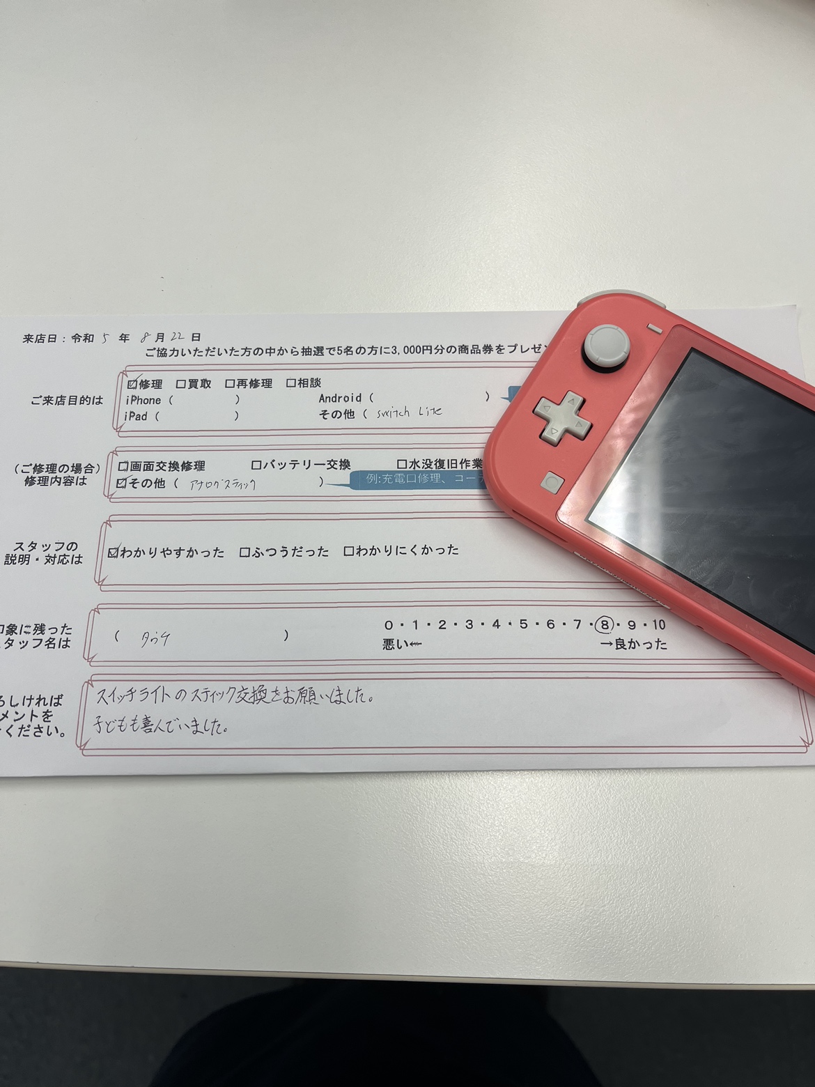 Switchliteのスティック交換をお願いしました。子供も喜んでいました。