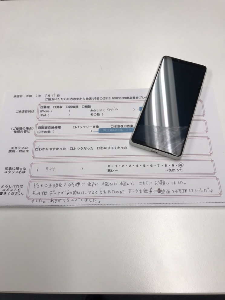 正規店で修理に出すか悩んでこちらにお願いしました。 正規店ではデータが初期化になると言われたが、データも無事に画面を修理していただけました。 ありがとうございました。